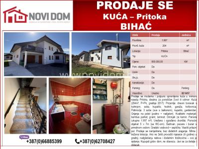 Prodaje se moderna i potpuno opremljena kuća u mirnom naselju Pritoka, idealna za porodičan život ili odmor. Kuća (204m², P+Pk, gradnja 2017): Prizemlje: dnevni boravak s kuhinjom, soba, kupatilo, hodnik, garaža, kotlovnica; Potkrovlje: 3 sobe (sve s balkonom), kupatilo, garderober, Grijanje na pelet (podno + radijatori). Kvalitetni materijali: bambus parket, granit, laminat. Dimnjak za kamin. Parcela (ukupno 1.997 m²). Uređeno i ograđeno dvorište. Pomoćni objekat 5 x 7m (sa WC-om). Šedrvan, pecara i bunar s prirodnom vodom. Gradski vodovod + septička. Vlastiti prilazni put. Prodaje se namještena, bez dodatnih ulaganja. Mirna i tražena lokacija. Ako ne želiš provoditi mjesece (ili godine) u gradnji, nadgledanju radova i dodatnim troškovima – ovo je rješenje. Kupuješ gotov dom, ne obavezu. Javi se za detalje i obilazak.