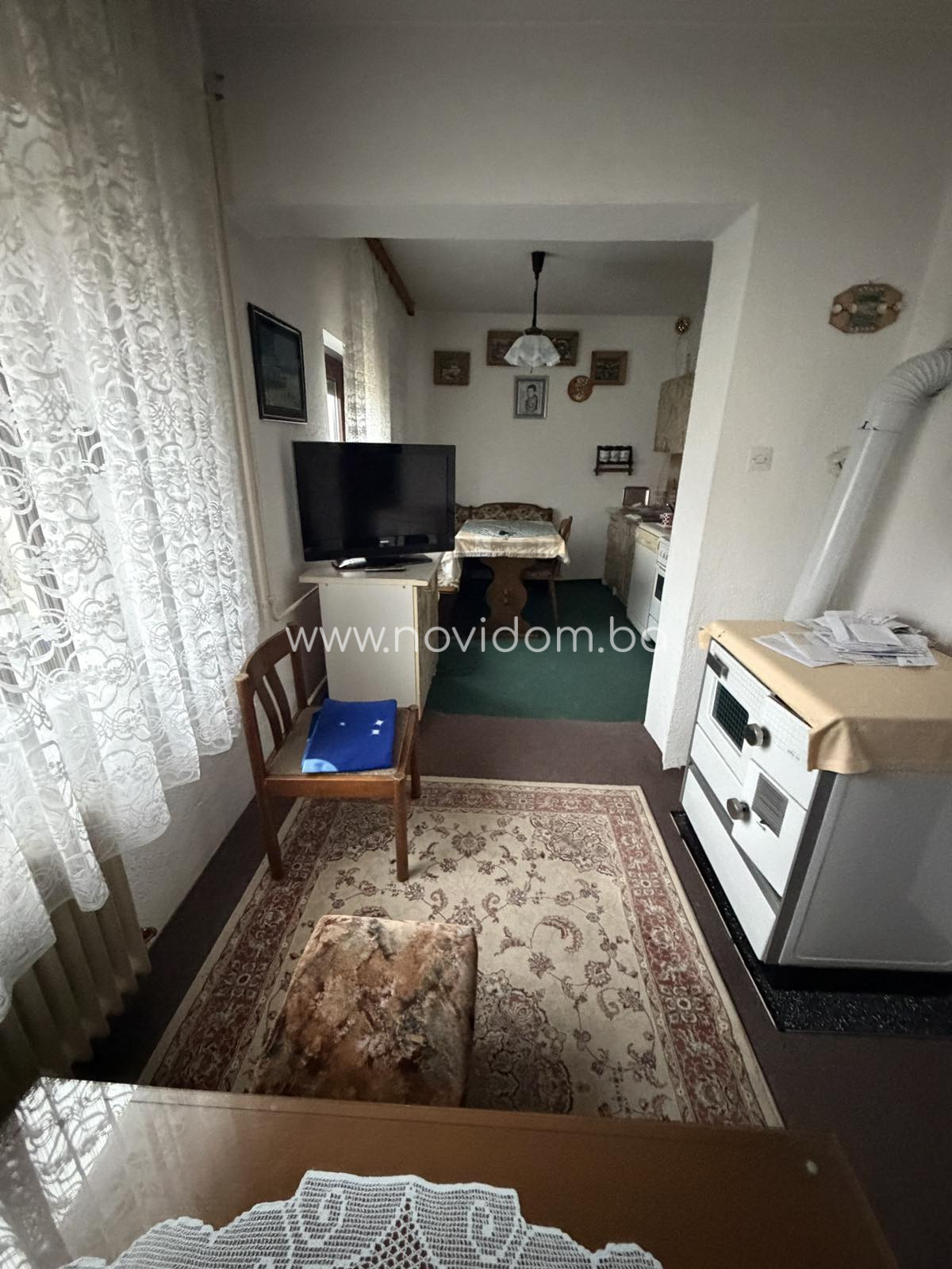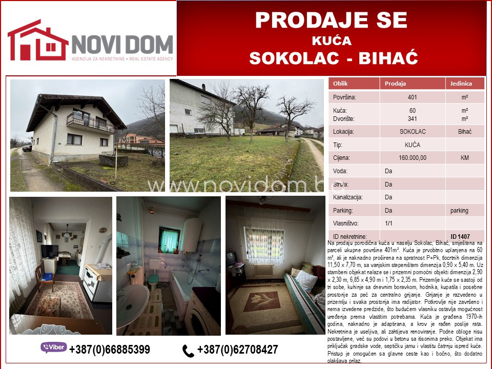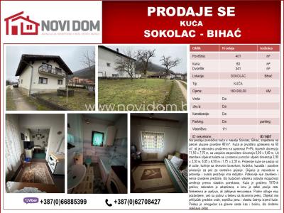 Na prodaju porodična kuća u naselju Sokolac, Bihać, smještena na parceli ukupne površine 401m². Kuća je prvobitno uplanjena na 60 m², ali je naknadno proširena na spratnost P+Pk, tlocrtnih dimenzija 11,50 x 7,70 m, sa vanjskim stepeništem dimenzija 0,90 x 5,40 m. Uz stambeni objekat nalaze se i prizemni pomoćni objekti dimenzija 2,90 x 2,30 m, 6,85 x 4,90 m i 1,75 x 2,35 m. Prizemlje kuće se sastoji od tri sobe, kuhinje sa dnevnim boravkom, hodnika, kupatila i posebne prostorije za peć za centralno grijanje. Grijanje je razvedeno u prizemlju i svaka prostorija ima radijator. Potkrovlje nije završeno i nema izvedene predzide, što budućem vlasniku ostavlja mogućnost uređenja prema vlastitim potrebama. Kuća je građena 1970-ih godina, naknadno je adaptirana, a krov je rađen poslije rata. Nekretnina je useljiva, ali zahtijeva renoviranje. Podne obloge nisu postavljene, već su podovi u betonu sa itisonima preko. Objekat ima priključak gradske vode, septičku jamu i vlastitu čatrnju ispred kuće. Pristup je omogućen sa glavne ceste kao i bočno, što dodatno olakšava prilaz.