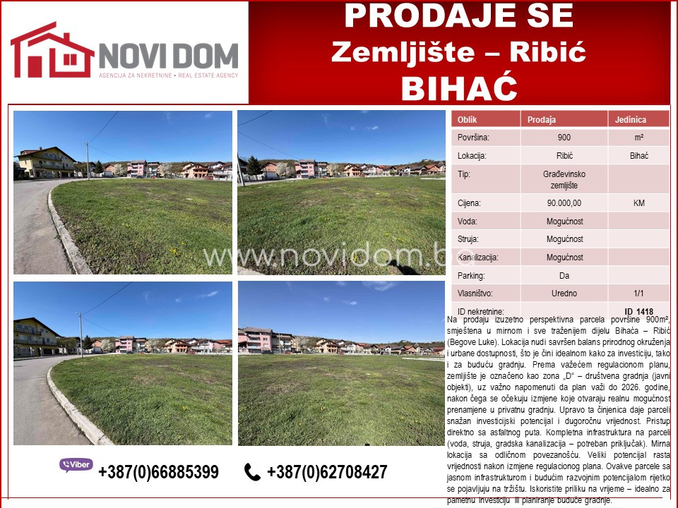 Na prodaju izuzetno perspektivna parcela površine 900m², smještena u mirnom i sve traženijem dijelu Bihaća – Ribić (Begove Luke). Lokacija nudi savršen balans prirodnog okruženja i urbane dostupnosti, što je čini idealnom kako za investiciju, tako i za buduću gradnju. Prema važećem regulacionom planu, zemljište je označeno kao zona „D“ – društvena gradnja (javni objekti), uz važno napomenuti da plan važi do 2026. godine, nakon čega se očekuju izmjene koje otvaraju realnu mogućnost prenamjene u privatnu gradnju. Upravo ta činjenica daje parceli snažan investicijski potencijal i dugoročnu vrijednost. Pristup direktno sa asfaltnog puta. Kompletna infrastruktura na parceli (voda, struja, gradska kanalizacija – potreban priključak). Mirna lokacija sa odličnom povezanošću. Veliki potencijal rasta vrijednosti nakon izmjene regulacionog plana. Ovakve parcele sa jasnom infrastrukturom i budućim razvojnim potencijalom rijetko se pojavljuju na tržištu. Iskoristite priliku na vrijeme – idealno za pametnu investiciju ili planiranje buduće gradnje.