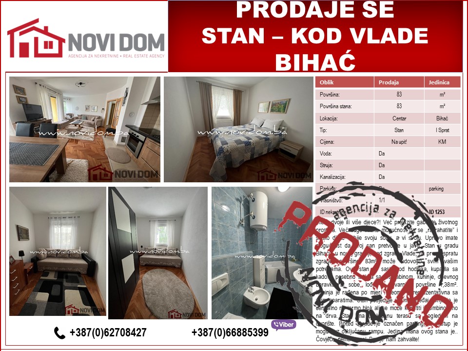 Imate dvoje ili više djece?! Već prelazite gabarite životnog prostora. Već dugo tražite mogućnost da se „razrahatite” i svako dijete dobije svoju sobu, a vi svoju. Upravo imate mogućnost da svoj san pretvorite u javu. Stan u gradu Bihaću, u novoj gradnji, kod zgrade Vlade, na prvom spratu zgrade, površine 83m² može udovoljiti svim vašim potrebama. Ovaj stan se sastoji od hodnika, kupatila sa kadom, posebno toaleta sa tuš kabinom, kuhinje, dnevnog boravka, tri sobe, lođe, te drvarnice površine 1,38m². Kuhinja je rađena po mjeri i veoma je reprezentativna sa svim aparatima. Stan posjeduje i klima uređaj. Grijanje je centralno na termo blok ali se može koristiti i kombinovano na drva. Stan ima prekrasnu terasu sa pogledom na dvorište. Ispred zgrade je označen parking, a pristup je moguć uz otključanu rampu. Jedina mana ovog stana je.. Čovječe, nema mane! Poslije nam zahvalite!
