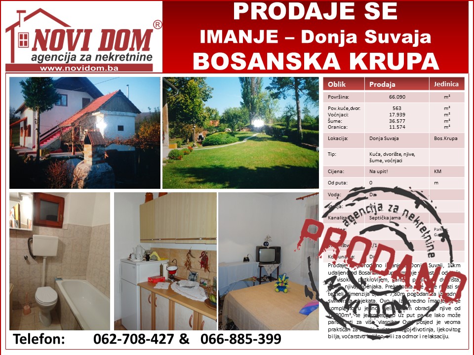 -Prodaje se porodično imanje u Donjoj Suvaji, 10km udaljeno od Bosanske Krupe. Imanje se sastoji od kuće sa visokim potkrovljem, garaže, podruma, dvorišta, šuma, njiva, voćnjaka. Preko puta ove kuće nalazi se temelj dimenzija 8,30 x 7,80m pogodan za izgradnju svih vrsta objekata. Ovo je izvanredno imanje, te je kompletno u jednoj cjelini osim obradive njive od 12.000m², te je smješteno uz put pa se lako može parcelisati za više vlasnika. Ovaj posjed je veoma praktičan za seoski turizam, uzgoj životinja, ljekovitog bilja, voćarstvo i slično, ali i za odmor i relaksaciju.