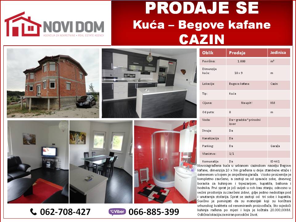 Cijena je na upit.U ponudi je kuća rađena u dvije stambene etaže, prizemlje i sprat i posjeduje dva odvojena stana. Smještena u ulici Darivalaca krvi u Cazinu u blizini gradskog vrtića. Kuća je renovirana sa kompletno završenim enterijerom. Da bi ova kuća dobila cjelokupni dojam potrebno je staviti fasadu koja će upotpuniti cjelokupni izgled. Unutrašnjost ove kuće je u potpunosti uređen. Na terasi koja se nalazi iza kuće je mjesto u kojem se možete opuštati i uživati u prelijepom pogledu u toplim ljetnim danima. Osunčana i prozračna sa predivnim pogledom na grad. Ova kuća je useljiva i pogodna za život svake porodice.
