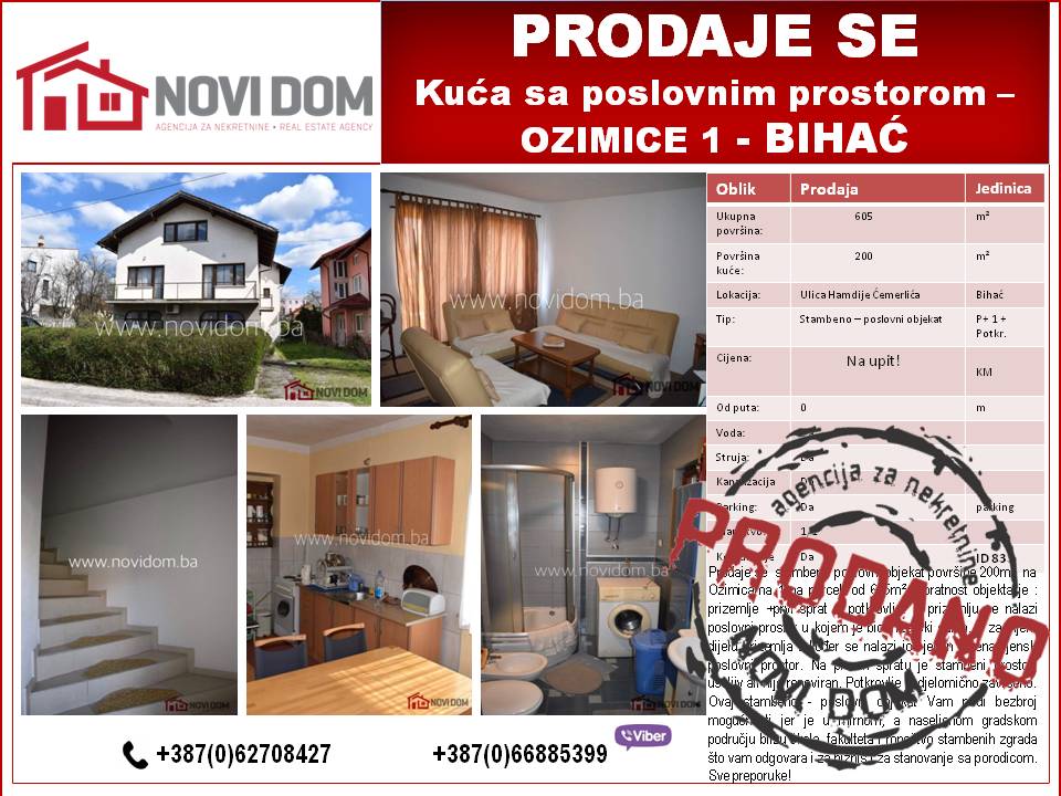Stambeno poslovni objekat površine 200m² na Ozimicama 1 na parceli ukupne površine od 605m². Spratnost objekta je : prizemlje +prvi sprat + potkrovlje. U prizemlju se nalazi poslovni prostor u kojem je bio frizerski salon. U zadnjem dijelu prizemlja također se nalazi još jedan višenamjenski poslovni prostor. Na prvom spratu je stambeni prostor, useljiv ali nije renoviran. Potkrovlje je djelomično završeno. Ovaj stambeno - poslovni objekat Vam nudi bezbroj mogućnosti jer je u mirnom, a naseljenom gradskom području blizu škola, fakulteta i mnoštvo stambenih zgrada što vam odgovara i za biznis i za stanovanje sa porodicom. Sve preporuke!