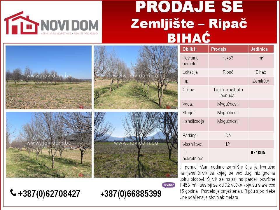 U ponudi Vam nudimo zemljište čija je trenutna namjena šljivik sa kojeg se već dugi niz godina ubiru plodovi. Šljivik se nalazi na parceli površine 1.453 m² i sastoji se od 72 voćke koje su stare cca 15 godina.  Parcela je smještena u Ripču a od rijeke Une udaljena je stotinjak metara.