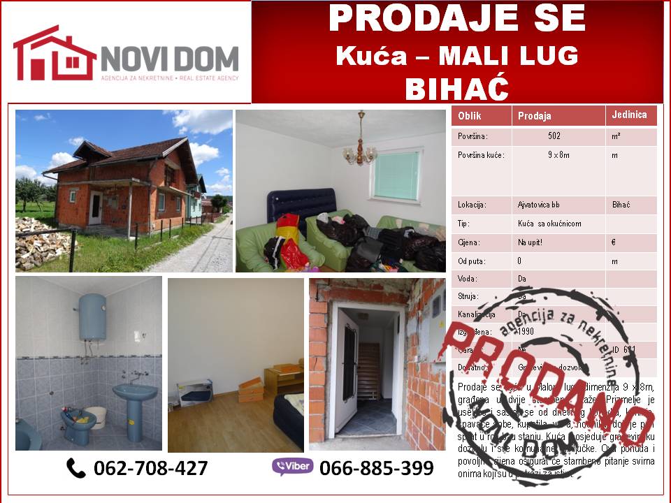 -PRODANO! Prodaje se kuća u Malom lugu dimenzija 9 x 8m, građena u dvije stambene etaže. Prizmelje je useljivo i sastoji se od dnevnog boravka, kuhinje, spavaće sobe, kupatila, wc-a, hodnika, dok je prvi sprat u roh bau stanju. Kuća posjeduje građevinsku dozvolu i sve komunalne priključke. Ova ponuda i povoljna cijena osigurat će stambeno pitanje svima onika koji su u potrazi za istim.