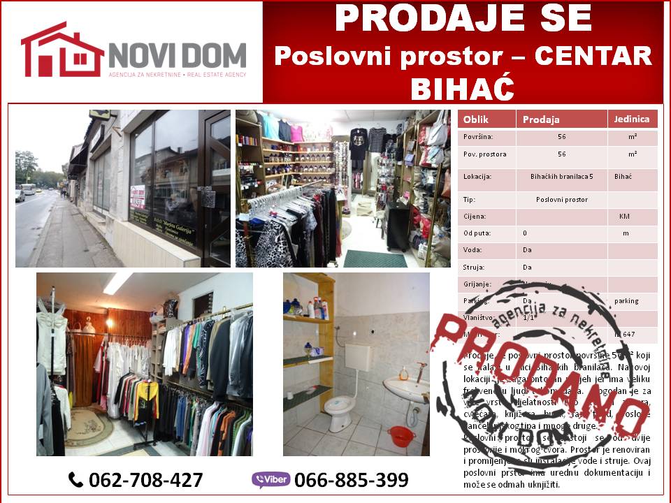 -PRODANO!!! Prodaje se poslovni prostor površine 56m² koji se nalazi u ulici Bihaćkih branilaca. Na ovoj lokaciji je zagarontovan uspjeh jer ima veliku frekvenciju ljudi tokom dana. Pogodan je za više vrsta djelatnosti kao što su zlatara, cvjećara, knjižara, butik, fast food, poslove kancelarijskog tipa i mnoge druge. Poslovni prostor se sastoji se od dvije prostorije i mokrog čvora. Prostor je renoviran i promijenjene su instalacije vode i struje. Ovaj poslovni prstor ima urednu dokumentaciju i može se odmah uknjižiti.