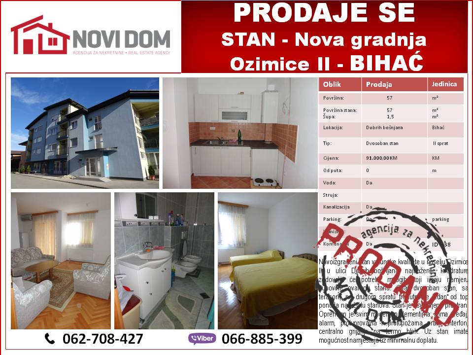 PRODANO! Novoizgrađeni stan vrhunske kvalitete u naselju Ozimice II u ulici Dobrih bošnjana, najtraženije kvadrature zadovoljit će potrebe mnogih koji imaju namjeru kupovine ovakvog stana. Ovaj dvosoban stan, sa terasom, na drugom spratu trenutno je jedan od top ponuda na tržištu stanova. Stan je osvijetljen i prostran. Opremljen je svim modernim elementima: klima uređaj, alarm, protuprovalna i protupožarna vrata, interfon, centralno grijanje na termo blok. Uz stan imate mogućnost namještaja uz minimalnu doplatu.
