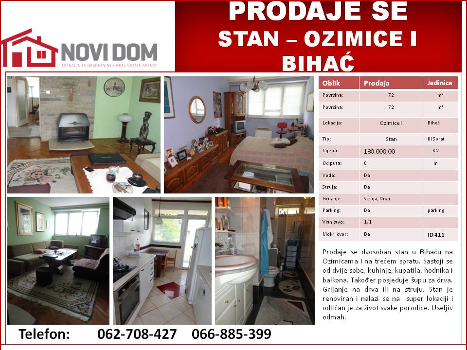 129.999 KM 1.806 KM/m2Prodaje se trosoban stan u Bihaću na Ozimicama I na trećem spratu. Sastoji se od dvije sobe, kuhinje, kupatila, hodnika, balkona i dnevnog boravka. Također posjeduje šupu za drva. Grijanje na drva ili na struju. Stan je renoviran i nalazi se na super lokaciji i odličan je za život svake porodice. Useljiv odmah.